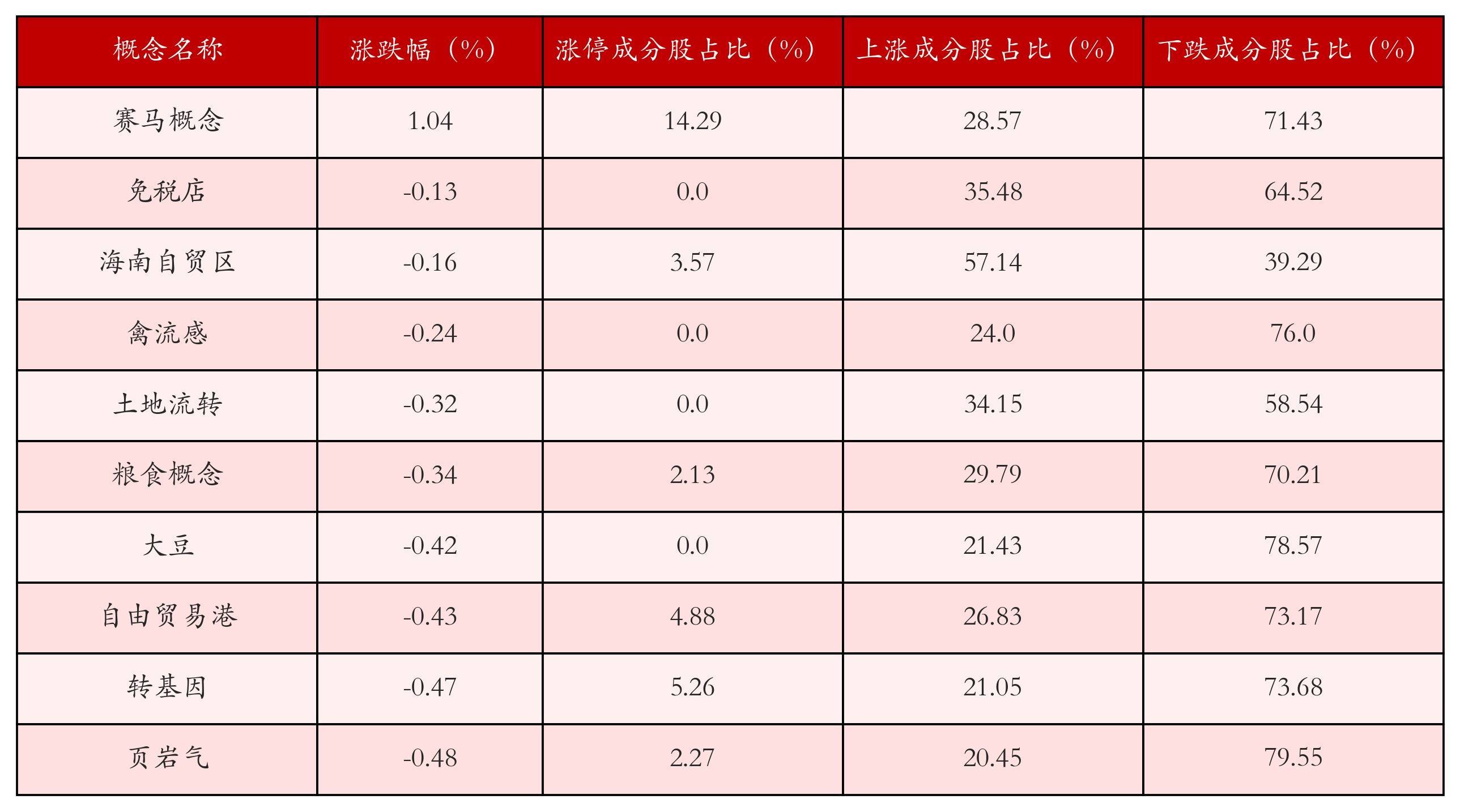 根据A股概念涨跌幅与所对应的股票池综合分析,涨幅靠前的三个概念板块分别为:赛马概念、免税店与海南自贸区。排名前10位的概念板块相关数据见下表: