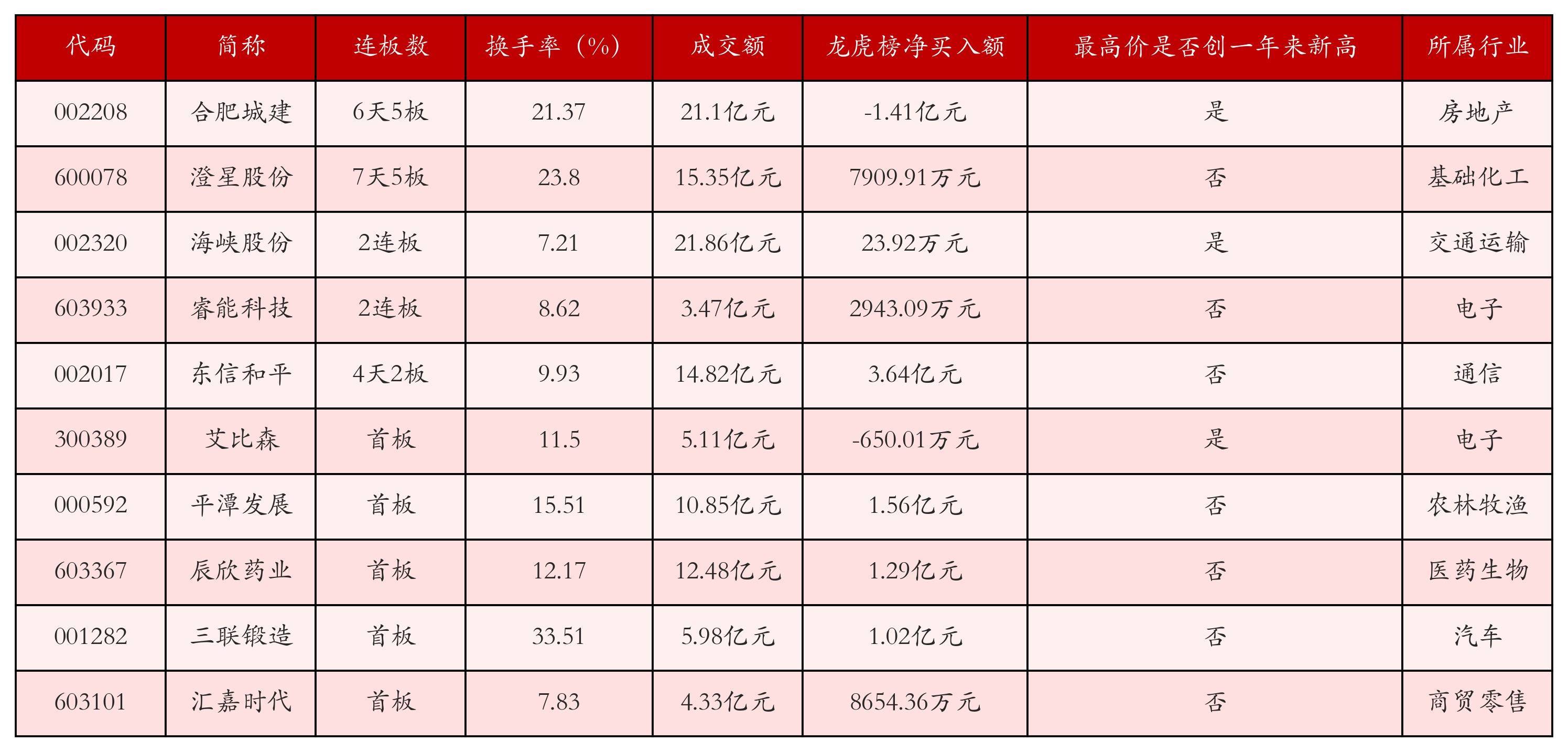 截至10月17日收盘,上证综指下跌1.95%,收于3839.76点,深证成指下跌3.04%,收于12688.94点,创业板指下跌3.36%,收于2935.37点。今日沪深两市A股共计44只涨停,综合当前连板数以及当日龙虎榜数据,其中较为强势的前三只个股分别为:合肥城建(002208)、澄星股份(600078)与海峡股份(002320)。今日强势个股前10位具体数据见下表: